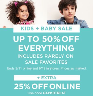 优惠GAP 童装最大规模特卖!全场童装(含最新款)5折起,额外再打7.5折!成人服饰额外再打6折!满50元送25元抵用券!