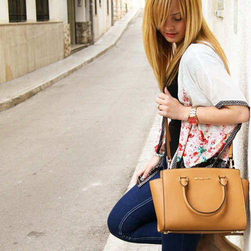 Michael Kors网店销售,原价:278元,现价:145.95元包邮。点击进入订购页面。 选用超柔软真皮材质,外观小巧别致,可手提或肩背,顶部拉链开合,内有3插袋,1手机袋,1钥匙扣,侧面拉链口袋。尺寸为38 x 25 x 14厘米。