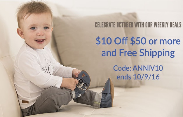 Robeez网店销售, 全场婴儿学步鞋满50元,使用折扣码:ANNIV10 立减10元,包邮,截止日期10月9日。点击进入订购页面。
