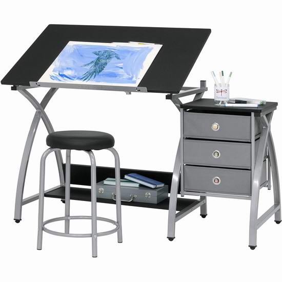 Amazon网店销售,原价:233.99加元,现价:148.97加元包邮,点击进入订购页面。 本套装包含绘画桌和凳子,绘画桌采用重型钢结构,经久耐用,桌面最高可倾斜40度,桌子侧面配备3层布艺收纳抽屉,桌面尺寸为36 x 23.75英寸。