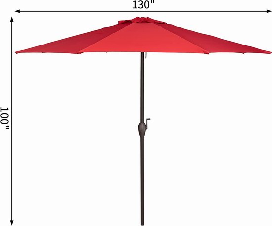 采用钢杆结构+涤纶伞面,防水、防褪色、防紫外线,伞面直径长达10-11英尺(3.04-3.35米),可调节伞面角度,摇动手柄可打开或关闭伞面,适合在庭院休息、就餐、BBQ、打麻将时使用,给炎热的夏天带来凉爽。本品不含底座。