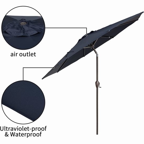 采用直径1.5英寸钢杆结构+涤纶伞面,防水、防褪色、防紫外线,伞面直径长达9英尺(2.74米),可调节伞面角度,摇动手柄可打开或关闭伞面,适合在庭院休息、就餐、BBQ、打麻将时使用,给炎热的夏天带来凉爽。伞面宽度足够覆盖42-54英寸的圆形、方形或矩形桌子。本品不含底座。