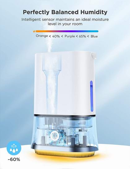 此款加湿器具有4L大容量,26dB低噪音运行,不会影响睡眠,出雾量可调节,加满水后可持续工作12-50小时,一旦水用完它会自动关闭,安全可靠。360度旋转喷嘴散发出高达2英尺的超精细冷雾,为您提供清爽的空气,同时超声波加湿器蒸发水并发出冷雾,可以提供水分,保护您的皮肤,加湿范围可达20-40米。内置2700K暖色夜灯。