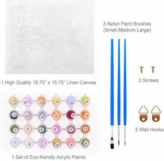本品包含一个印有数字的填色草图帆布,多色颜料,3个画笔和2个挂钩,尺寸为40x50厘米。