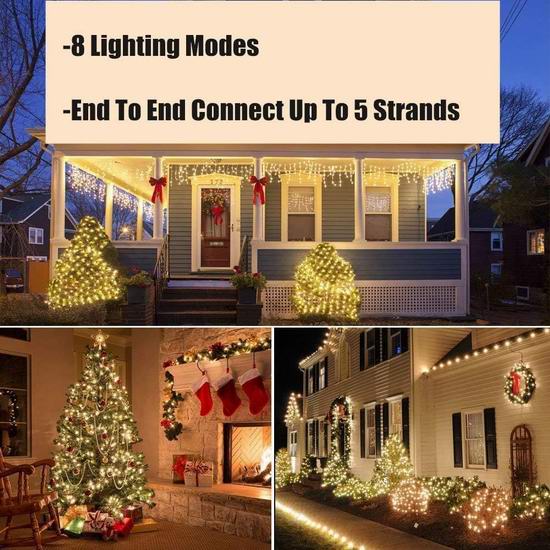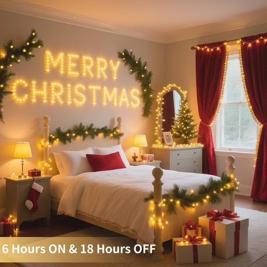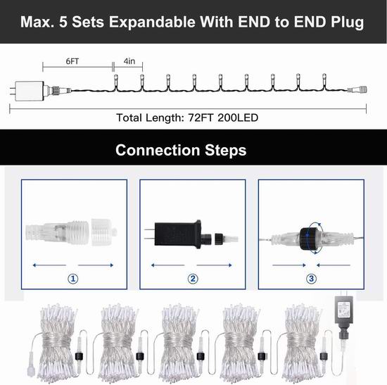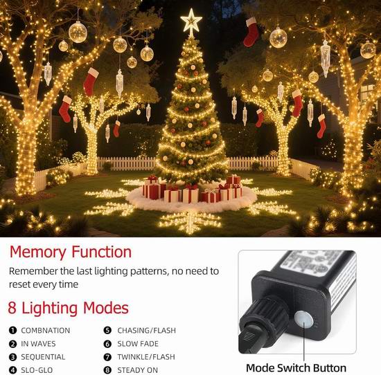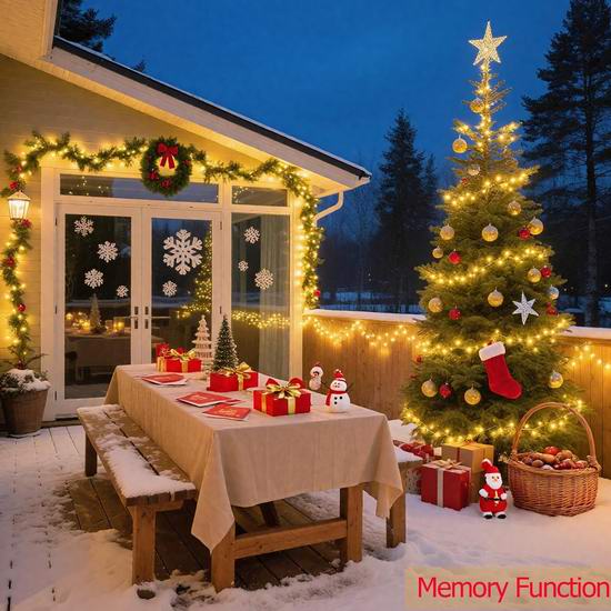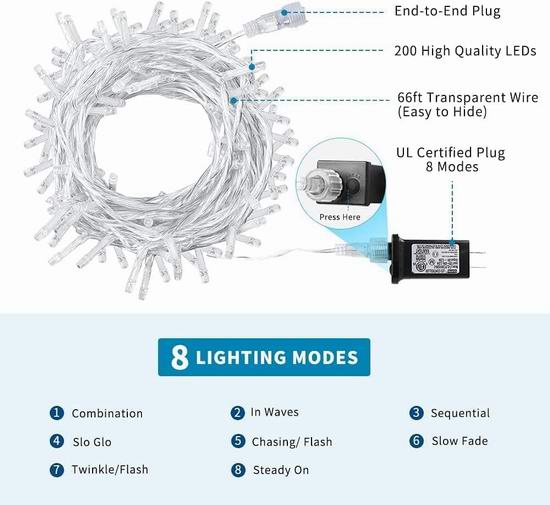 这款仙女灯串长达20米,配备200个LED灯,有8种灯光模式:组合模式、波浪模式、顺序模式、慢速闪烁模式、追逐/闪烁模式、慢速淡入模式、闪烁/闪光模式和常亮模式。支持定时开关功能,每天自动亮6小时,然后熄灭18小时。IP44防水,通过UL588安全认证,室内外均可使用。