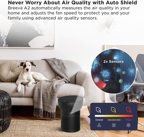 Breeva A2空气净化器提供了3档风速的选择,集成红外灰尘和VOC传感器,可实时监测空气质量,在自动模式下,可根据环境情况,调节空气净化速度。可以在12分钟内有效净化182平方英尺的房间,30分钟内净化441平方英尺的房间。具有低至 26db 的超静音睡眠模式,支持2/4/8小时定时关机,具有儿童锁功能,防止宠物和儿童误触。内置蒸发式加湿器,可保持周围空气湿润,不会造成二次污染,有助于缓解充血和鼻窦炎等过敏症状,让您在第二天早上感到神清气爽,加湿器在加满水后,可持续加湿8小时。