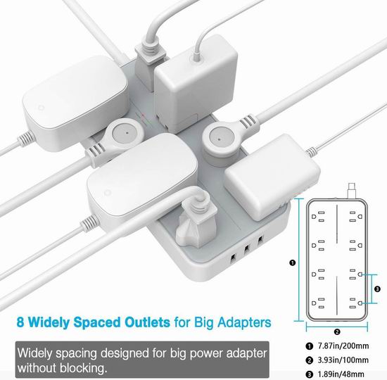内置8个插座口和3个USB充电口,单口提供5V/2.4A输出,总输出可达3A/15W,内置新型过载保护开关,在电流、电压大幅波动、短路时,可自动切断电源,电源线长6英尺。