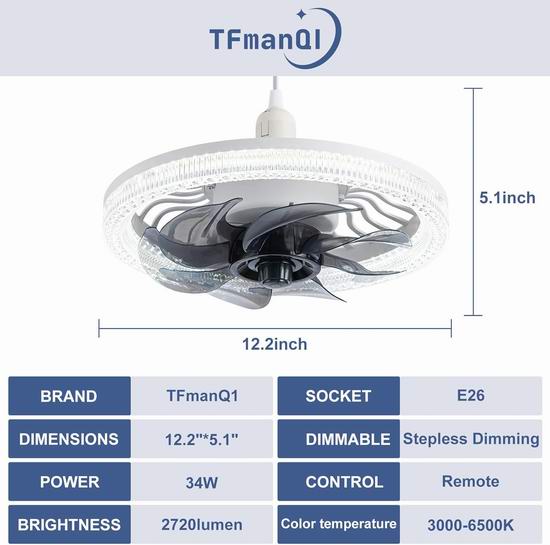 历史新低!TFmanQ1 12英寸 可遥控 LED吊扇灯4.1折 25加元包邮!