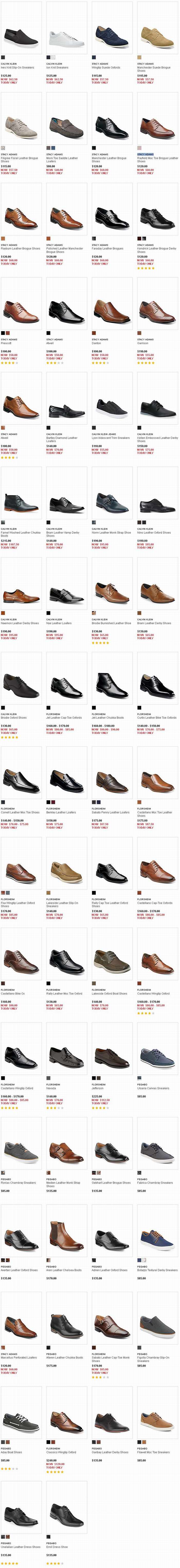 The Bay网店销售,精选66款 Calvin Klein、Stacy Adams、Florsheim 等品牌男式皮鞋、休闲鞋全部5折限时特卖,运费5.95元起,全站满99元包邮,点击进入订购页面