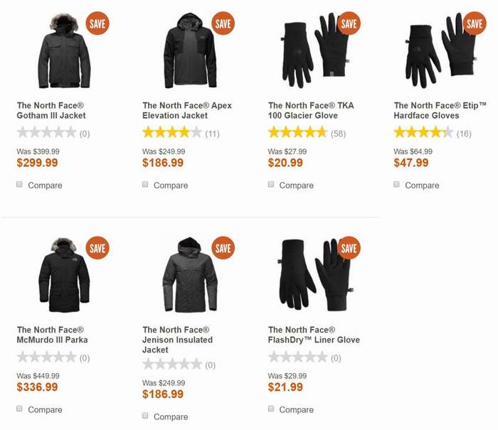 Cabelas网店销售,精选 7款 The North Face 冬季户外防寒服、手套 7.5折 20.99加元起特卖,满99加元使用折扣码:BLOWOUT 包邮,点击进入订购页面。