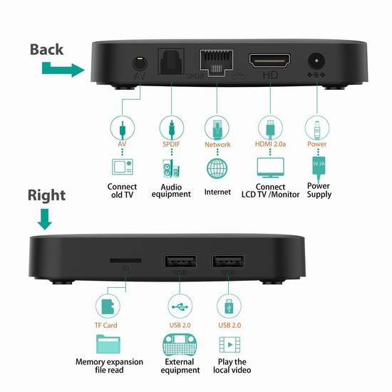 搭载2.0GHz Amlogic S905X四核处理器,2GB DDR3内存,16GB空间,Android 6.0操作系统,支持4K高清视频,支持H.265(HEVC)和VP9解码,内置WiFI。