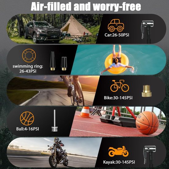 采用紧凑设计,重量仅528克,内置6000mAh锂电池和空气压缩机,配备液晶数字屏,具有4种充气模式,可预设充气压力(3-160psi),空气流量高达20升/分钟,当压力到达预设值时自动停止充气,内置SOS照明灯,可为汽车、自行车、婴儿车、篮球、皮球等充气,具有安全锤功能,当电池电力耗尽时,可接入汽车电源使用。