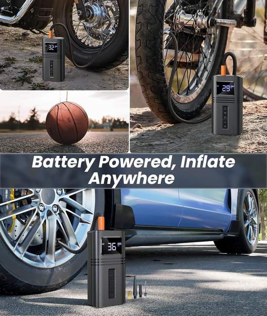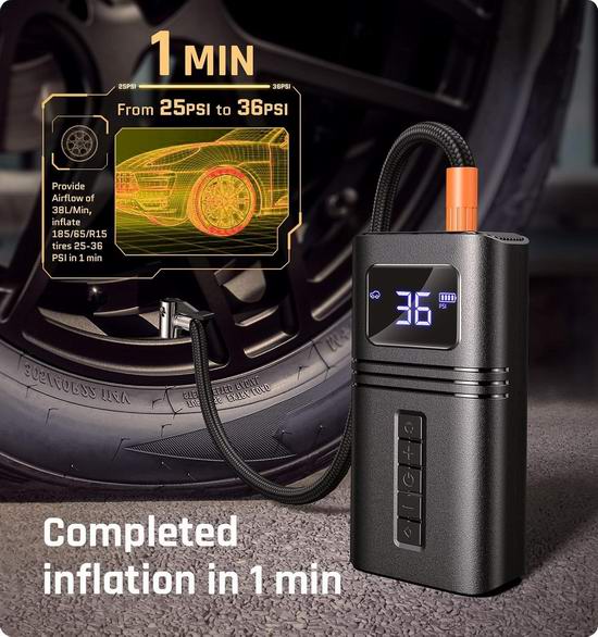 这款轮胎充气泵采用涡轮式设计,内置强劲的24缸气泵,可提供高达150 PSI的最大压力和38升/分钟的气流。只需5分钟即可将汽车轮胎充满(0-36PSI),或1分钟即可满足日常使用需求(28-35PSI)。配备大尺寸液晶数字显示屏,可显示四种压力单位:PSI、KPA、BAR 和 KG/CM。实时精准显示胎压数据,当胎压达到设定值时会自动停止,让您使用更安心。内置6000mAh大容量电池。充满电后,可为4个汽车轮胎从0-35 PSI充气,或从28-35 PSI充气约12次。内置超亮LED灯,两种照明模式(常亮和闪烁),充满电后,灯光可持续照明7小时。
