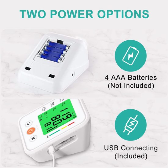 此款血压计配备高清易读大屏幕,带三色背光,不同血压等级对应不同颜色,一键操作,全自动测量血压和心跳速率,可储存2人 x 99组数据,紧凑型设计,方便随身携带,需USB电源或4节AAA电池供电。
