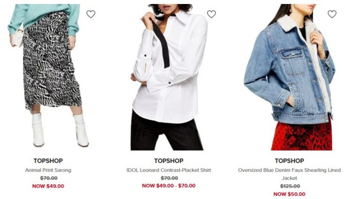 The Bay网店销售,TOPSHOP清仓特卖:打底衫8.8加元、T恤15加元、牛仔裤26加元、白色衬衣31加元,满99加元包邮。点击进入订购页面。