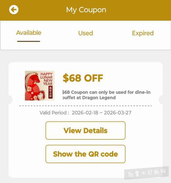 多伦多龙珠汇自助餐厅(Dragon Legend)装修焕新升级,为庆祝重新开业,推出超值福利,2月18日至3月27日期间,每逢周一至周五(假日除外),只要4位成人同行,即可使用68加元现金券立减优惠!现在即可通过官方手机App免费领取现金券(下载链接:Apple、Google),让你的美食之旅更超值!点击进入官网页面。