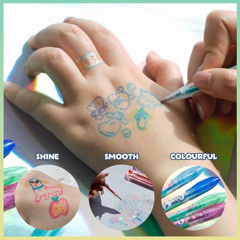 专为 3岁及以上儿童设计,包含多种亮丽闪光色彩(粉、绿、蓝、红、黑、金、银等),满足日常绘画与创意装饰需求。每支笔均印有可爱熊猫图案,兼具趣味与视觉吸引力,可用于纸张绘画、日记本装饰、DIY 手作以及安全的人体彩绘,为派对和节日造型增添闪亮效果。配方安全无毒,不含刺激性成分,使用后可用温水和肥皂轻松清洗,是激发孩子创造力与想象力的趣味美术礼物选择。