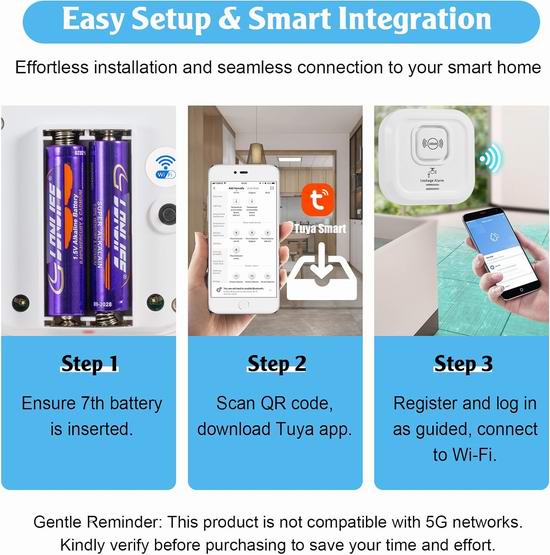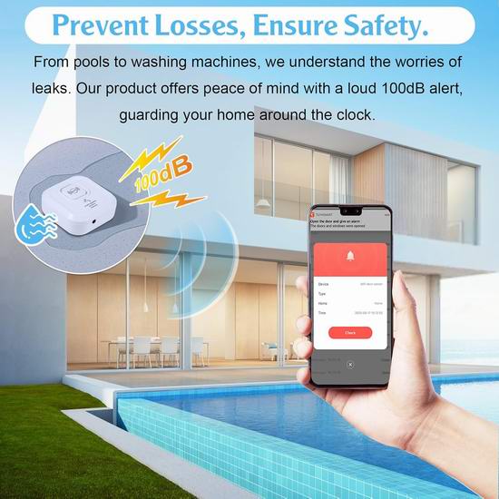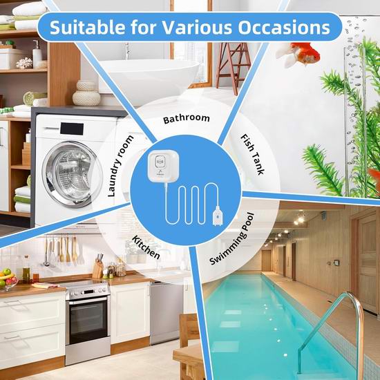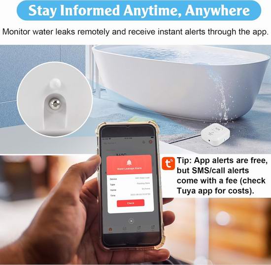 这款智能漏水检测器,支持2.4GHz WiFi,配备两组灵敏探头,底部探头用于检测地面积水或洪水,顶部探头用于检测上方滴水。无论是管道漏水导致的缓慢滴水,还是地面积水,传感器都能快速准确地响应。配备1米长的柔性传感电缆,可扩大监测范围,轻松检测难以触及区域的漏水情况。非常适合监测游泳池、浴缸、鱼缸以及冰箱下方、洗衣机后方或热水器周围等狭窄空间的水位。当检测到漏水、滴水或水淹时,您将立即收到手机APP通知。检测器支持100分贝警报,有助于在潜在的漏水损害扩大之前迅速做出反应。使用两节 AAA 电池供电(需另购),可提供长达 18 个月的可靠运行。低电量时将自动向手机APP发出更换电池提醒。