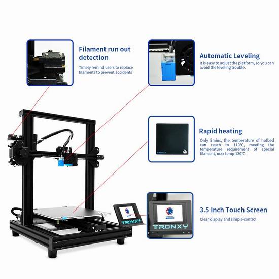 打印机采用铝型材框架,结构坚固,稳定性高。配备3.5英寸全彩色触摸屏,易于阅读和操作。打印机具有恢复打印功能,恢复供电后,打印机将从中断点继续打印。支持灯丝用尽检测,及时提醒灯丝短缺或灯丝切断。高品质的自动找平传感器,确保热床找平,提高打印精度。双风扇挤出机头,冷却效果更好,印刷更稳定,使用寿命更长。耐用的黑色贴纸,更易于拆卸模型,不要害怕刮擦表面。最大打印尺寸为255×255×245mm。