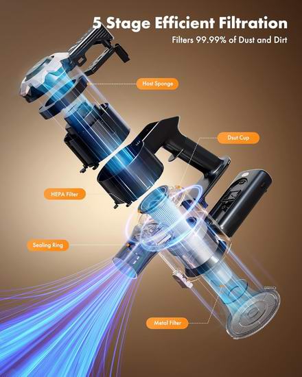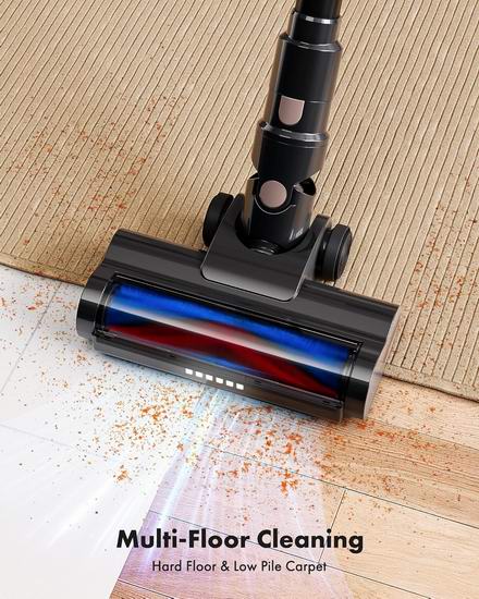T350无绳吸尘器配备实时LED显示屏,可显示清洁模式和电池电量,方便您随时掌握吸尘器的状态。强劲的吸力可轻松去除低绒地毯、硬木地板和家具表面的灰尘、宠物毛发和顽固污垢,实现深度高效清洁。配备带6颗LED灯的地板刷头,清洁家具和床底等隐蔽角落的灰尘效果极佳,确保不留任何死角。机身仅重3.3磅,单手即可轻松清洁高处和窗帘。配备带梳齿的吸头,可以轻松吸除地毯或硬地板上的长发和灰尘。搭配Trucozie设计的多种附件(17英寸至45英寸延长管/沙发刷/二合一吸嘴),可轻松转换为手持式吸尘器,满足各种日常清洁需求。内置5级先进过滤系统,可高效捕捉 99.99% 小至 0.1 微米的灰尘颗粒,避免二次污染内置7*2200mAh可充电电池组,节能模式续航45分钟,中等模式25分钟,强劲模式20分钟。
