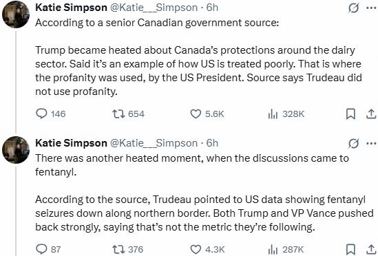 值得注意的是,特朗普与特鲁多在今天最近一次通话中,特朗普对加拿大保护乳制品行业的政策表达了强烈不满,认为这些措施助长了不公平的贸易行为。CBC记者凯蒂·辛普森(Katie Simpson)在社交平台X爆料,据政府知情人士透露,在这次通话中,特朗普使用了粗言秽语,而特鲁多则始终保持克制,没有做出类似的言辞。