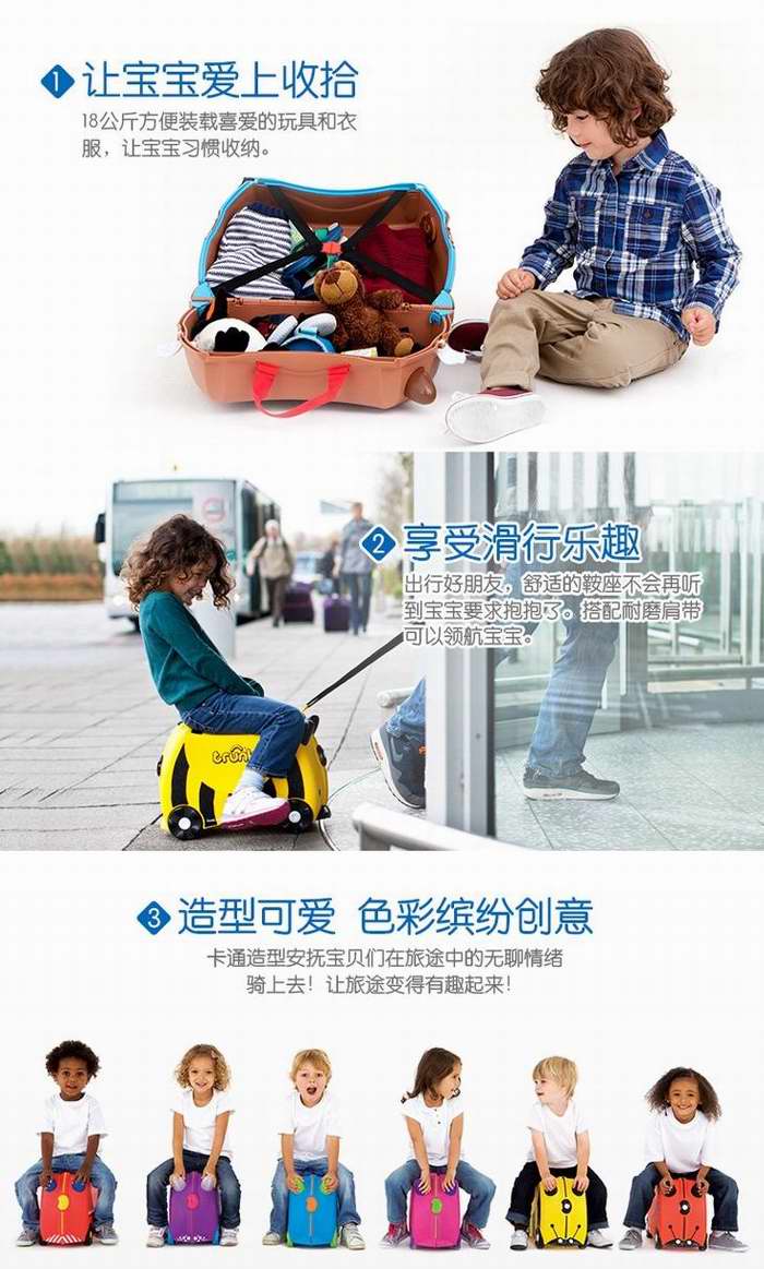 Trunki坐骑式行李箱的每一处细节设计都彰显着智慧,饱含趣味性,是小朋友们的旅行良伴,同时为父母提供一个实用的旅行解决方案。献给小小旅行家,从小培养孩子独立探索意识。圆孤设计、避免磕碰。配备肩带、孩子玩的更尽兴。保护手指、环保轻便耐用。安全装置,前后保护平衡,安全不翻车。安全锁扣,两端有锁扣,物品安全存放。整合轮子,加硬塑料轮胎,耐用持久。