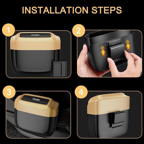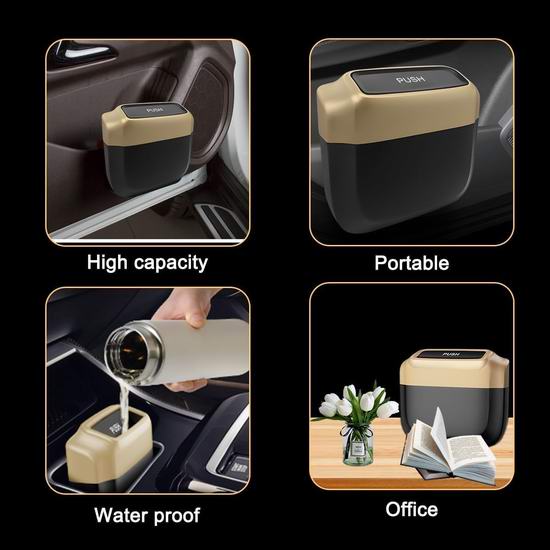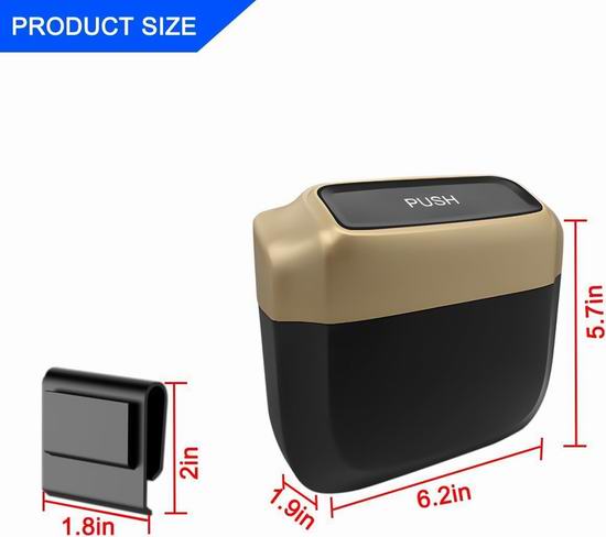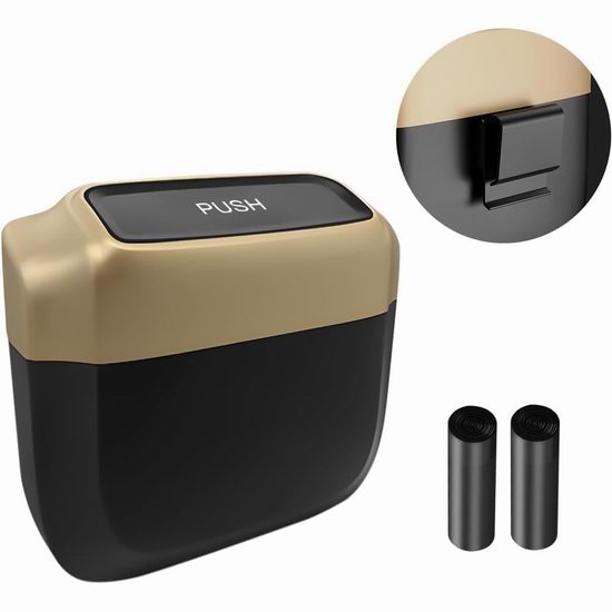 采用优质ABS塑料制成,防水防漏设计,避免液体意外泄漏。采用按压式顶盖设计,方便您轻松放入垃圾。配备高强度挂钩,只需将挂钩挂在车内任意位置,然后将垃圾桶挂上即可完成安装。附送2卷垃圾袋。