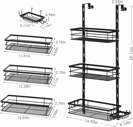 这款淋浴收纳架采用优质金属制成,防锈粉末涂层处理,镂空设计的底部可以快速排水,保持整洁干燥。每层收纳架高度可灵活调节,即使是大瓶洗浴用品也能轻松存放。架子通过可调节螺丝和吸盘固定在门上,确保稳固不摇晃。它还配有2个金属挂钩和2个可移动的肥皂架,方便悬挂剃须刀、沐浴海绵等物品。软垫保护,不会刮伤玻璃门和木门。