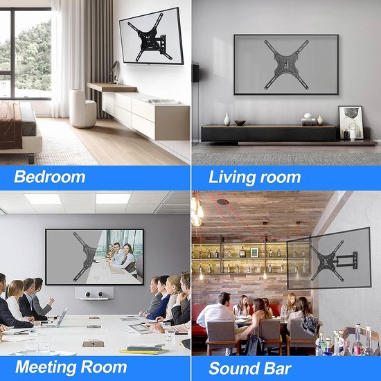 全动态电视壁挂支架,带旋转关节臂,采用合金钢制成,使电视安装支架坚固且安全,适用于大多数19-32英寸电视,可倾斜 +5°/-15° 以减少眩光并旋转 +/-90°。拉出至17英寸并缩回至2.36英寸。最大安装孔间距为 400x400 毫米(从 75x75 毫米到 400x400 毫米)。