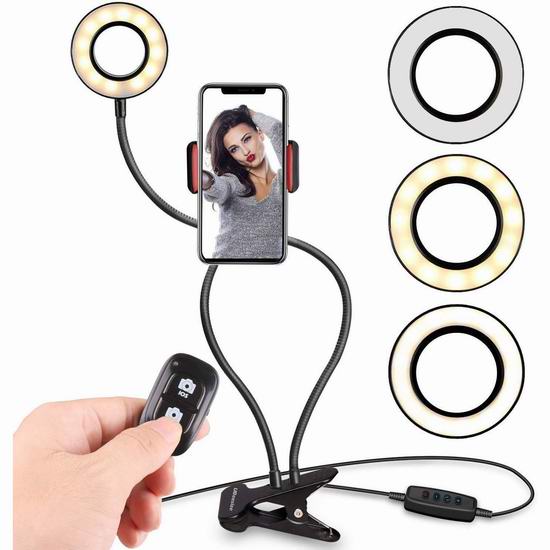 这是一款专业补光产品,不但可以大幅增加拍摄主体的亮度,而且还可以在眼睛中加入超美的天使眼效果,并且独有的柔光装置,让光线更柔和,在黑暗的环境中不刺眼,不会引起夜盲的现象出现,同时又能起到美肤的效果,加上3种可选的特殊色温和10级亮度调节,自拍达人们脸色红润,还原真是美丽,兼容iPhone和Android智能手机,部分款带自拍遥控,照明灯可单独作为台灯使用。