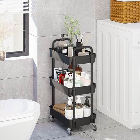 UDEAR 三层厨房推车(白色)配备 3 个大容量镂空收纳篮(单篮约 39×29×7cm),提供充足分层收纳以提升空间利用率;采用塑料篮筐与把手搭配金属支撑管,兼顾轻便与耐用;底部 4 个脚轮便于移动,其中 2 个可锁定以提升停放稳定性,并配双把手推拉更顺手;镂空结构利于通风排水、保持物品干燥整洁,适用于厨房、浴室、客厅或办公室等多场景,按说明与工具约 10 分钟即可完成组装。