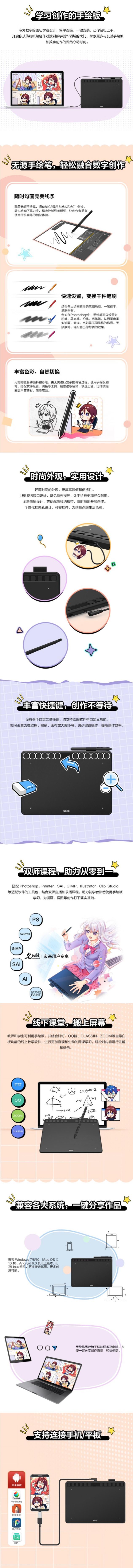 专为数字绘画初学者设计,简单连接,一键安装,让你轻松上手,开启你从传统纸绘创作过渡到数字创作领域的大门。无源手绘笔,轻松融合数字创作,随时勾画完美线条,配置无源手绘笔,拥有8192级压力感应和60°侧锋,敏锐感知下笔力度,精准控制线条粗细,让创作者拥有,使用传统画笔的相似体验。快速设置,变换千种笔刷,结合各大绘画软件的笔刷功能,一笔在手,笔刷全有。