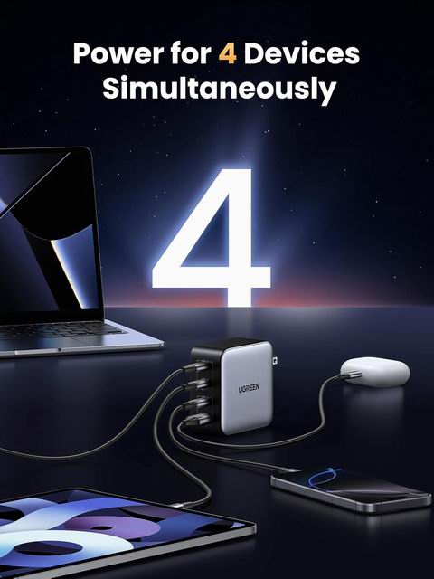 采用 GaN 技术与可折叠插头设计,小巧便携,单个 USB-C端口最高可达 100W(最大 5A),可为笔记本电脑提供快速充电;同时配备 3个 USB-C + 1个 USB-A共四个端口,支持多设备并行供电,手机、平板、笔记本一套搞定。兼容性覆盖 MacBook Pro/Air、iPad Pro、iPhone 17 系列、Galaxy S25、Pixel、Steam Deck、Dell XPS 等主流设备;但受 Dell 充电协议限制,部分机型可能无法达到满速充电。安全方面内置动态温度传感器与智能 PWM 芯片,可实时监控温度并智能调节功率输出,提升充电稳定性与保护性,适合桌面日常与旅行出差场景使用。