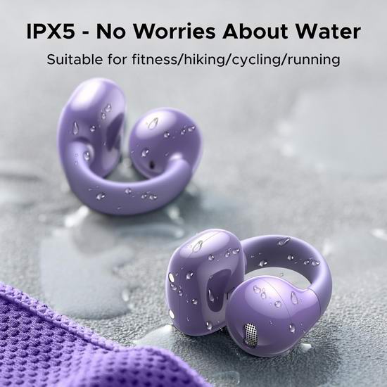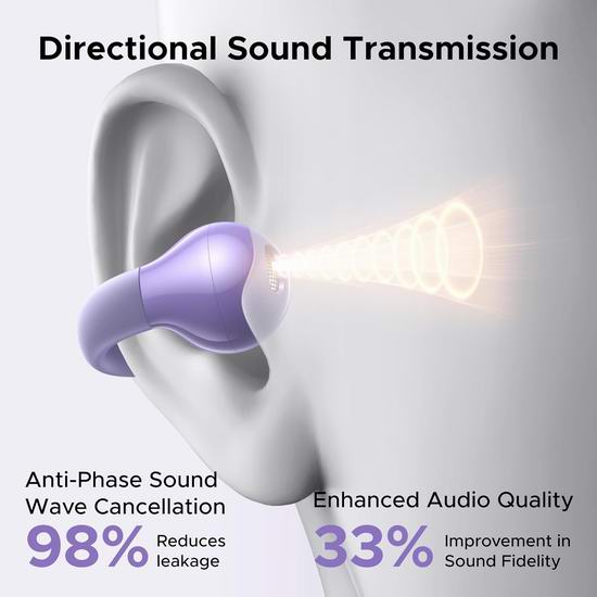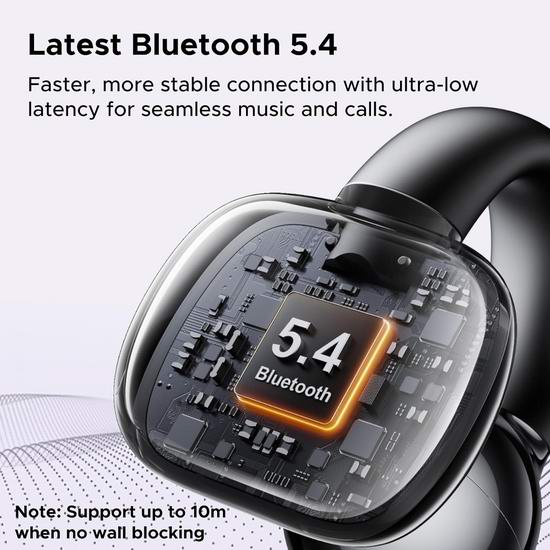 这款开放式耳夹耳机采用空气传导蓝牙技术,真正实现无痛无害的佩戴体验。无需将耳机塞入耳道,即使长时间听音乐也不会感到耳朵酸痛。符合人体工学的耳廓贴合设计,可根据用户耳形自动调节夹力。搭载12mm扬声器和复合振膜,带来强劲的低音和清晰的中音。支持双设备连接模式,可在两台设备间无缝切换。每个耳塞都内置麦克风,方便通话。ENC 降噪功能可确保对方清晰地听到您的声音。耳机采用先进的蓝牙5.4技术,提供稳定且低延迟(80毫秒)的无线连接,带来高品质音效和通话。耳机续航可达7.5小时,配合充电盒续航超过30小时,支持充电15分钟续航120分钟。