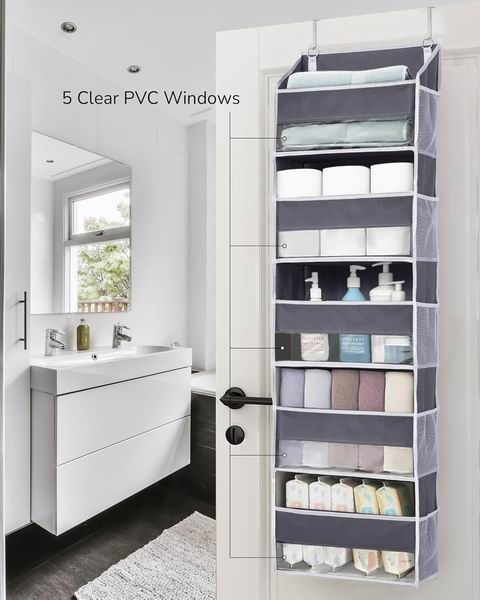 采用透气耐用的无纺布材质,配有 5 个大容量主袋(14.5×6.5×6.5 英寸)和 10 个网状侧袋,可承重达 44 磅,为玩具、尿布、鞋子等提供充足收纳空间。每个口袋均设透明 PVC 窗口,便于快速查看物品;内部加固纸板结构稳固不易变形。附 2 个金属挂钩,适用于厚度 2 英寸以下的门,安装便捷,广泛适用于卧室、浴室、育儿室、洗衣房或宿舍,让收纳更整洁高效。