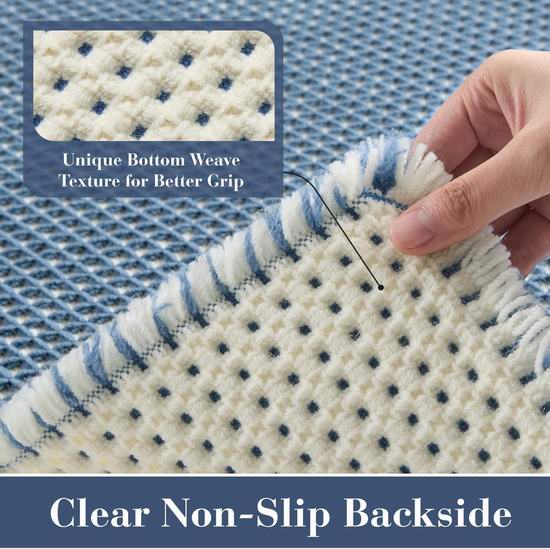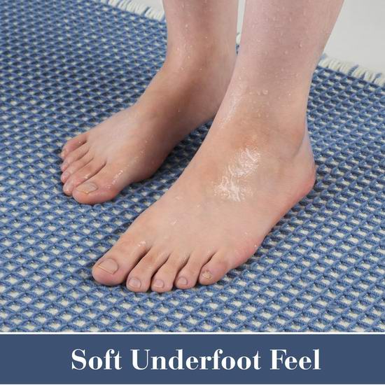 这款华夫格针织浴室地垫采用独特的双色纱线编织设计,抓地力更强。华夫格纹理,透气性极佳。结合高吸水性纱线,可快速锁住水分,防止水渍产生,确保浴室地面干净整洁。背面采用透明热熔胶,不仅不影响地垫外观,还能使地垫更牢固地贴合地面,防滑效果更佳。尺寸为43 x 61厘米。