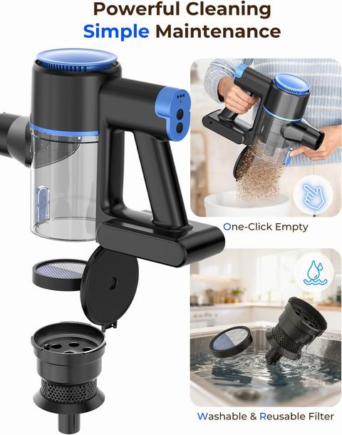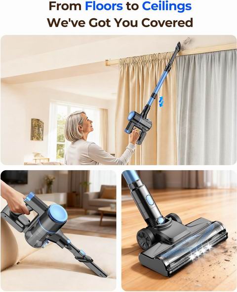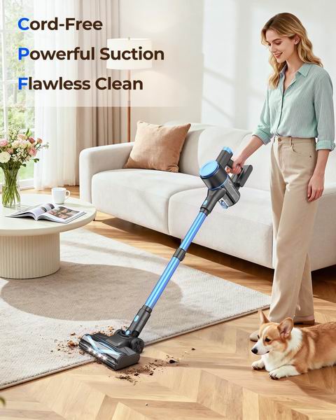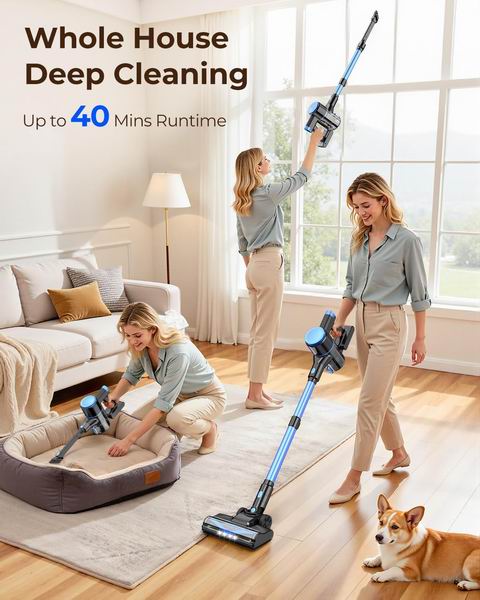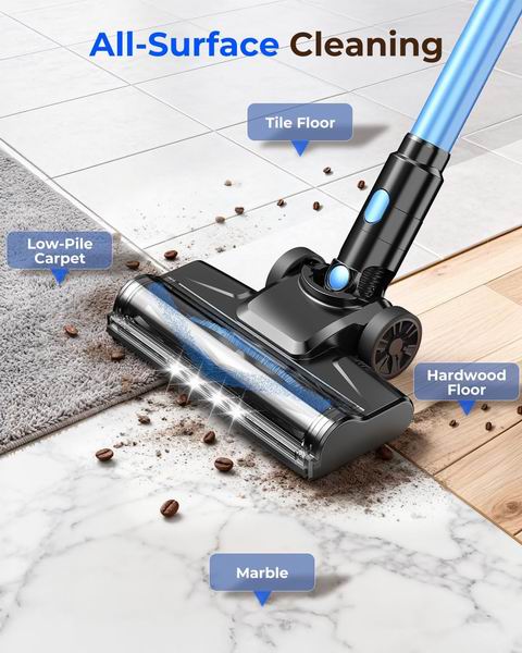 一款轻量高效的家用吸尘器,主机仅重2.9磅,采用自立式设计,可随时停放或壁挂收纳。它提供40KPa强劲吸力和长达40分钟的标准续航(配备2200mAh电池),并配有防缠绕V型电动滚刷、可多向旋转的灵活吸头及五重过滤系统,能有效清洁硬木地板、地毯上的灰尘、碎屑和宠物毛发,操作便捷。
