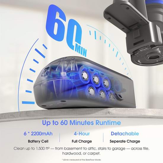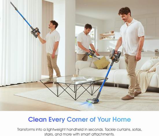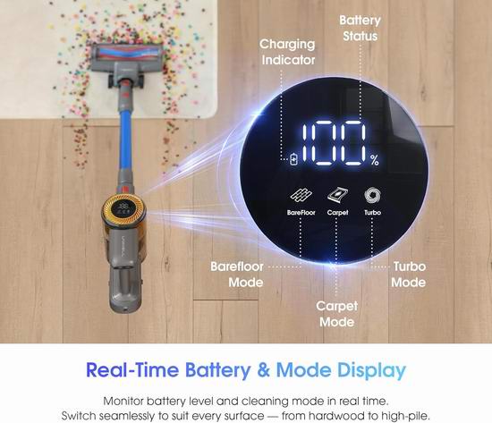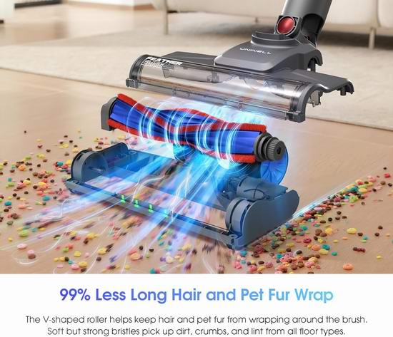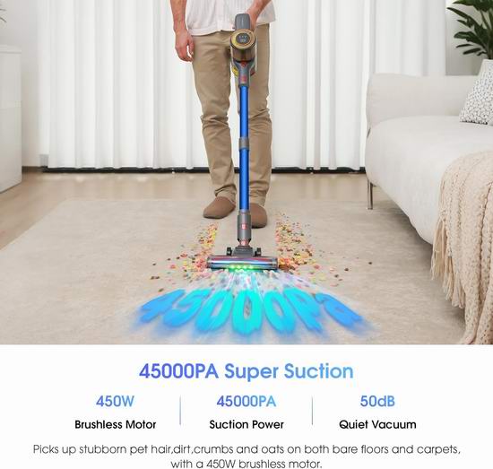 配备450W无刷电机,可提供45KPA的强劲吸力,轻松去除顽固碎屑和细小灰尘。采用自动增压技术,关机时会自动增强吸力3秒,确保管道和地板刷中的碎屑、灰尘和毛发在机器停止运转前被完全吸入。多级过滤系统可捕获 99.97% 的灰尘和微粒,释放更洁净的空气。灵活的刷头可平放,轻松清洁床底,并可180°旋转绕过家具腿。内置4个LED灯,黑暗中无死角。自立式设计,可直立放置在任何平面上,无需靠墙。伸缩杆可适应各种清洁场景,并以2厘米为单位进行精确调节,可拆卸刷头可瞬间变身为手持吸尘器。配备6芯高容量电池,充电4-5小时,即可提供长达60分钟的清洁时间。