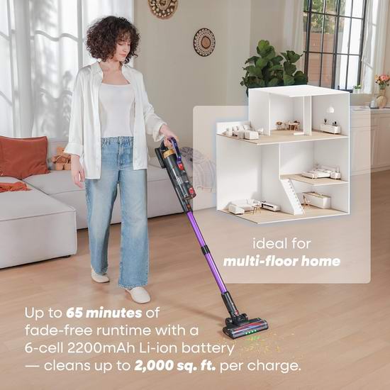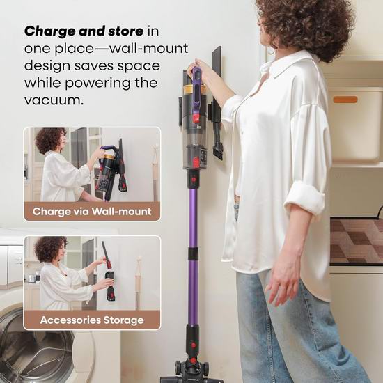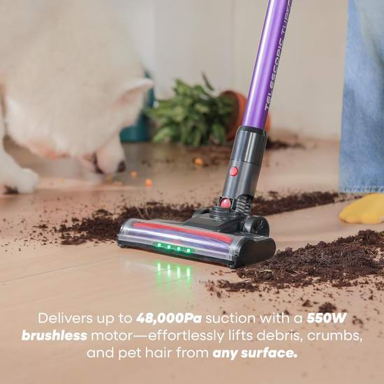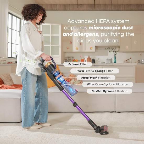 UNINELL UV2 无绳吸尘器搭载550W无刷电机,提供高达 48KPa 的强劲吸力,能瞬间吸除大颗粒灰尘、宠物毛发、长发、饼干碎屑以及缝隙中的碎屑。拥有三档可调节吸力,满足日常清洁、深度清洁和顽固污渍去除等各种清洁需求。充电4-5小时,即可提供长达65分钟续航时间。配备 270° 灵活刷头、符合人体工学的多角度手柄、180° 低矮平放设计以及可伸至家具底部 65 厘米的可伸缩软管。它可以轻松清洁桌腿下方、墙边和床底。内置明亮 LED 灯,可以照亮隐藏的灰尘。采用独立站立式设计,无需靠墙。还配备一个壁挂式充电收纳底座——只需连接充电器,挂上吸尘器即可开始充电。搭载六重过滤系统,可捕捉99.99%的微尘、细菌和尘螨,小至0.3微米。1.6L大容量集尘盒,无需频繁倾倒即可清洁全屋。