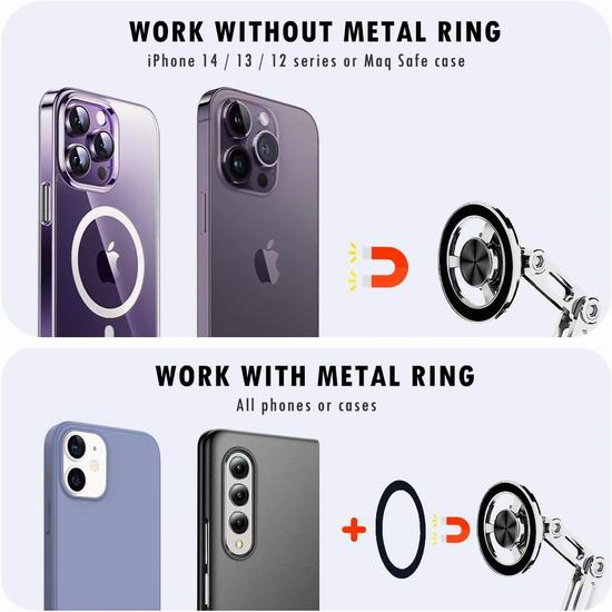 这款手机支架采用强力磁吸设计,支持360°旋转,轻松调节角度,内置20个强力磁铁,可牢固吸附手机,即使在颠簸路面上也能牢牢固定手机。采用纳米粘合剂,强力固定底座,移除时不留痕迹,可安装于汽车仪表盘、挡风玻璃或者桌面上。兼容于所有智能手机,非磁性手机可使用配送的金属环固定。
