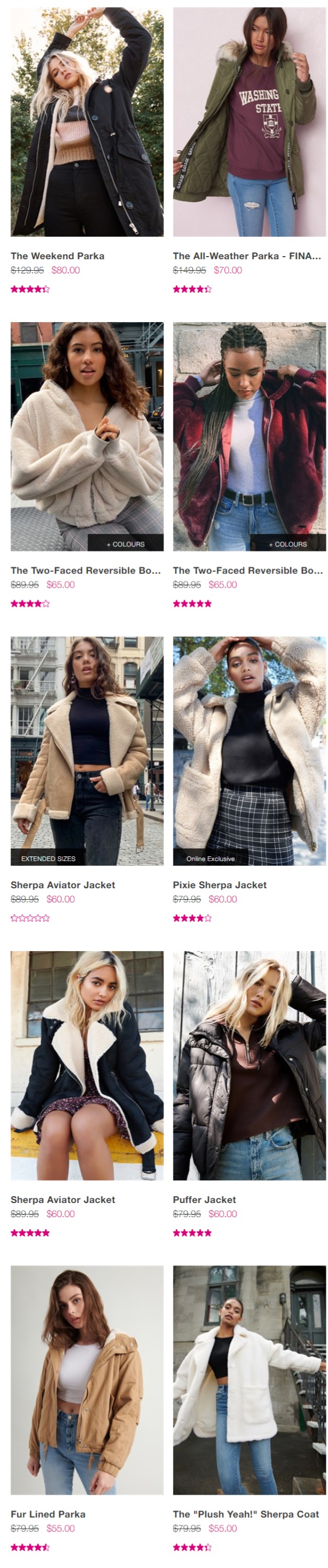 GARAGE网店销售,折扣区女士夏尔巴衬里夹克、泰迪熊外套、防寒服 4.7折起特卖,满40加元包邮。点击进入订购页面。