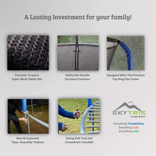 采用耐腐蚀镀锌钢结构,非常稳固,保护罩安装在蹦床内部,杜绝意外发生,高级超厚泡沫保护垫覆盖弹簧,更加安全耐用,总直径15英尺(4.57米),最大承重330磅。