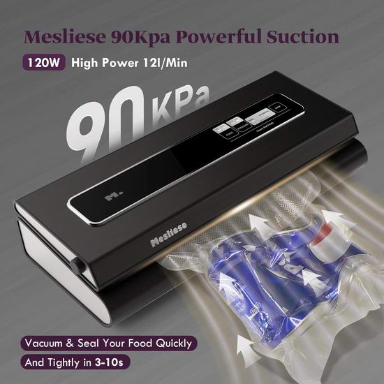 Mesliese 真空封口机拥有90kPa强大吸力,可轻松高效地抽真空各种食物,与普通储存方法相比,能让食物和水果保持新鲜时间延长 10 倍。6合1设计,具有“干湿”模式、“正常和柔软”模式,以及“密封”和“真空和密封”选项,还可使用真空管为罐子、酒瓶等进行真空保存。设备支持连续20次封口,120W 电机提供强劲吸力,仅需数秒即可完成真空和密封,确保食物保存轻松高效。设备采用不锈钢表面和弧形真空室设计,易于清洁且卫生。配件包括真空卷、预切袋、空气吸入软管和备用配件等,满足多种保存需求。设备加宽至 12mm 的加热条和 5 层加热丝设计,提供更安全、均匀、持久的密封效果。