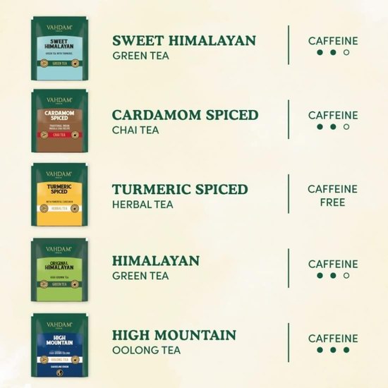 套装包含喜马拉雅绿茶、姜黄五香花草茶、小豆蔻马萨拉柴茶、高山乌龙茶和甜喜马拉雅绿茶。每种茶都注入了直接来自优质种植园的芳香印度香料,探索印度浓郁的异国风味。