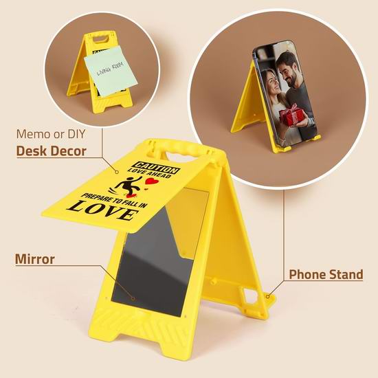 这款迷你浪漫又有趣的标牌“前方有爱,准备好坠入爱河吧!”充满浪漫与幽默,是情人节的理想礼物。这款浪漫迷你标牌,掀开正面即可露出隐藏的镜子,方便您随时查看妆容。背面可用于书写便条、情话或DIY艺术作品,还可以用作手机支架,方便观看视频。