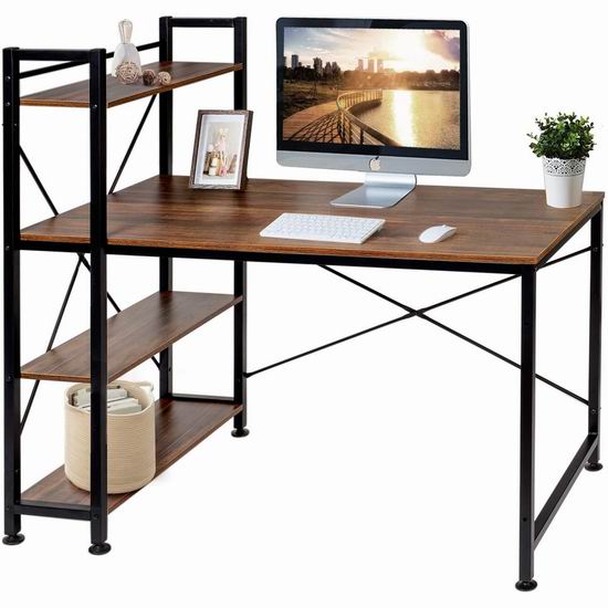 创新书架+书桌二合一设计,金属管框架结构,木纹桌面,雅致复古,简洁大方,桌面宽敞,4层书架可用于收纳书籍、文具、电脑主机箱、音箱、打印机、光盘等物件,非常实用,最大承重200磅。