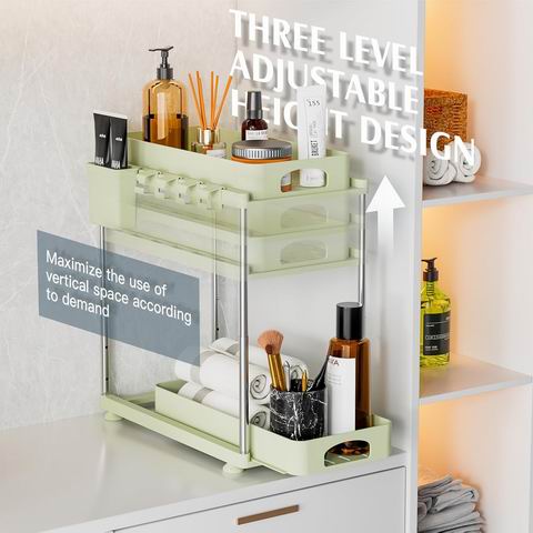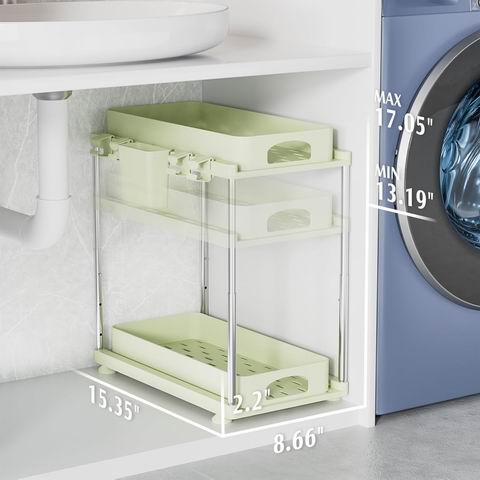 采用升级加厚 ABS 材质与不锈钢支撑管结构,稳固耐用、防潮防锈,承重力更强;双层抽拉式设计配合防脱轨结构,拉出顺畅且防止物品滑落,无需弯腰即可轻松取用。高度可在 13.19–17.05 英寸之间调节,适应不同橱柜空间;镂空层板便于排水,清洁简单。组装尺寸为 15.35″ × 8.66″ × 13.19–17.05″,适用于厨房水槽下、浴室柜、洗衣房或办公室等多场景收纳需求。