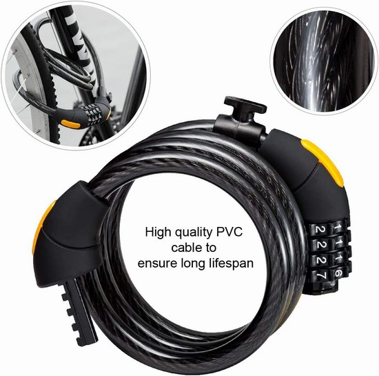 采用4位密码设置,无需钥匙,易于设置,锌合金锁芯,超高性能编织钢缆,长达4英尺,可用于自行车、烤箱、割草机、运动器材、院门等的锁定。