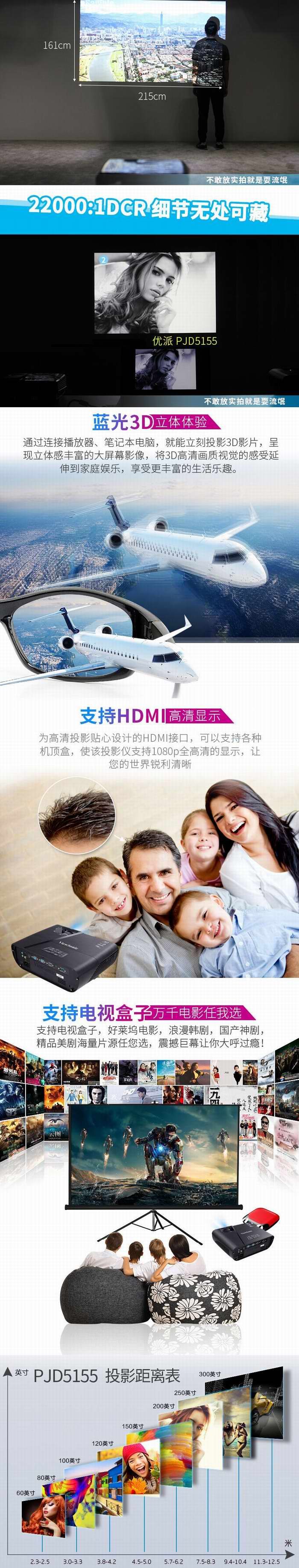 此款便携小巧,采用DLP投影技术,配置3300流明的亮度,支持蓝光3D输出能力,可提供1080P输出效果,有自动梯形校正功能,可满足商务及家庭娱乐使用,能提供清晰逼真的图文画面。具有独家超炫音技术,内建2瓦扬声器,拥有立体环绕音效输出能力。采用冷光源技术灯泡,寿命可长达10000小时。仅2.1千克的机身重量更方便桌面移动演示使用,以及作为3D家用影院。