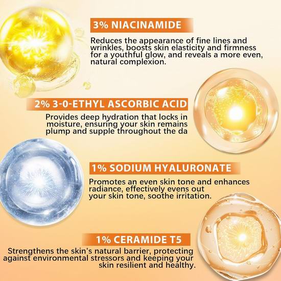 含3%烟酰胺、2% 3-O-乙基抗坏血酸(稳定的维生素C衍生物)、1%透明质酸钠和1%神经酰胺T5,可深层补水,减少肌肤干燥,均匀肤色,改善暗沉,令肌肤更显光泽。增强皮肤屏障,提供更好的保护,适合每日早晚使用。